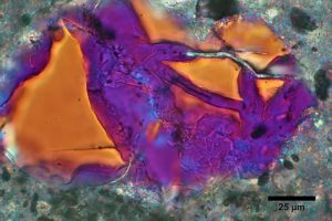 Orange = quartz; bleu à violet = produits de réaction du quartz et de la chaux; beige = liant. Lumière transmise polarisée et analisée et déplacement λ.