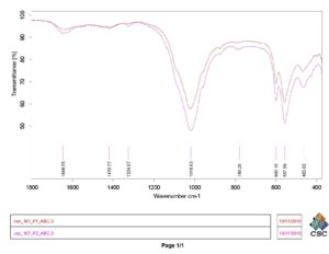 La spectrométrie FTIR est basée sur l’absorption d’un rayonnement infrarouge par le matériau analysé. Elle permet d’effectuer l’analyse des fonctions chimiques présentes dans le matériau via la détection des vibrations caractéristiques des liaisons chimiques. Ainsi, à un matériau de composition chimique et de structure données correspond un ensemble de bandes d’absorption de longueurs d’ondes caractéristiques qui se traduisent par des pics sur les courbes – ou spectres infrarouges – obtenues. La composition spécifique du matériau à analyser peut être déduite en superposant son spectre à ceux de matériaux de référence.
