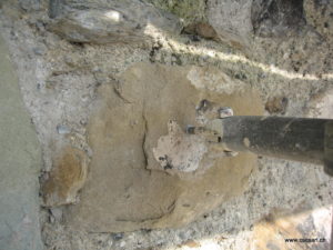 Nous avons donc pu informer notre client que la ruine romaine était recouverte, non pas de polychromies, mais d’hydroxyapatite qui s’est très probablement formée suite à la réaction entre les fientes d’oiseaux – riches en phosphates – et la chaux présente dans les matériaux de la ruine.