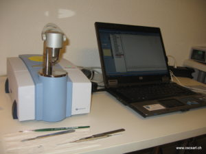 Depuis la fin de 2010, notre laboratoire possède un spectromètre infrarouge à transformée de Fourier (spectromètre FTIR) pour l’analyse des composés chimiques. Notre instrument est un spectromètre Bruker ALPHA-P avec ATR diamant.