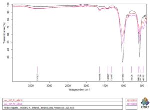 La spectrométrie FTIR est basée sur l’absorption d’un rayonnement infrarouge par le matériau analysé. Elle permet d’effectuer l’analyse des fonctions chimiques présentes dans le matériau via la détection des vibrations caractéristiques des liaisons chimiques. Ainsi, à un matériau de composition chimique et de structure données correspond un ensemble de bandes d’absorption de longueurs d’ondes caractéristiques qui se traduisent par des pics sur les courbes – ou spectres infrarouges – obtenues. La composition spécifique du matériau à analyser peut être déduite en superposant son spectre à ceux de matériaux de référence.